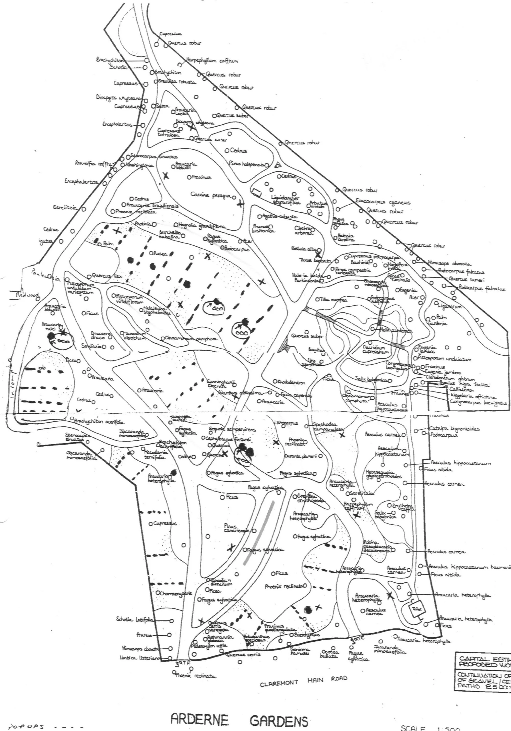 A thorough tree survey of the trees in Arderne Garden was conducted in 2015 and 414 trees are now listed. The bulk of this work was done by Adam Harrower of Kirstenbosch Botanical Gardens based on the original tree research map or Richard Jamieson. Visiting botanists that have assisted wth this work include Gary Shanks, Alasdair Moore, Adam Bligh, Jan Burring, Anne Bean (FOTAG), Martin Grantham and Thomas Pakenham.